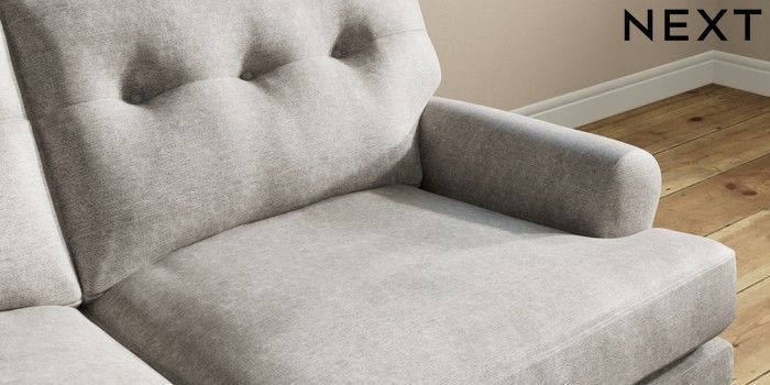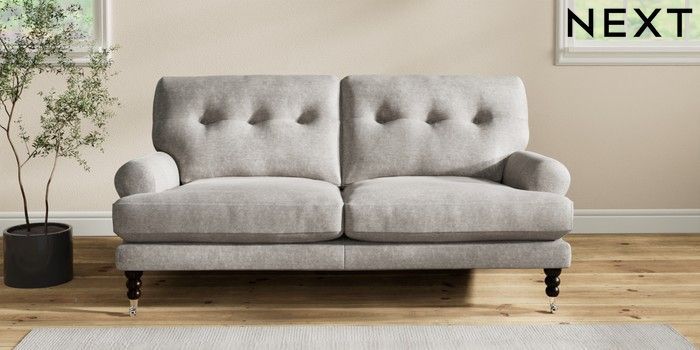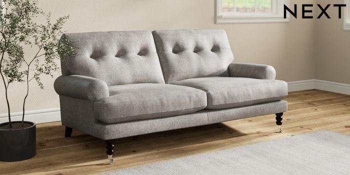 7.2.10 Erin Buttoned Back Deep Relaxed Sit 3 Seater Small Sofa Plush Chenille Light Grey High Classic Turned Chrome Castor - Dark | Made Click here to use our website with more accessibility support, for example screen readers