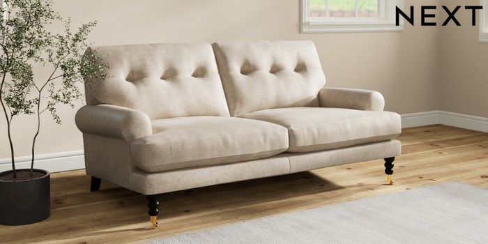 7.2.10 Erin Buttoned Back Deep Relaxed Sit 3 Seater Small Sofa Plush Chenille Light Natural High Classic Turned Brass Castor - Dark | Made Click here to use our website with more accessibility support, for example screen readers