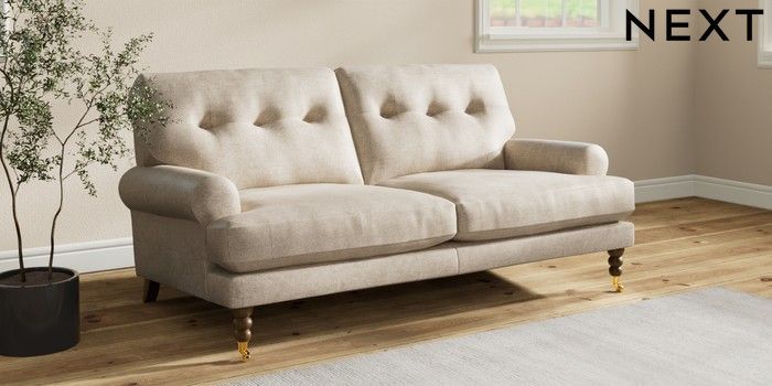 7.2.10 Erin Buttoned Back Deep Relaxed Sit 3 Seater Small Sofa Plush Chenille Light Natural High Classic Turned Brass Castor - Mid | Made Click here to use our website with more accessibility support, for example screen readers