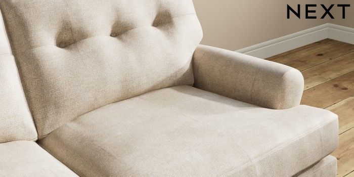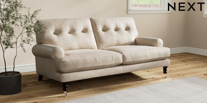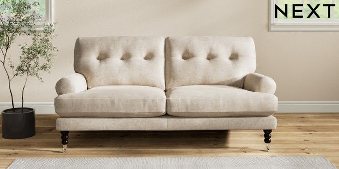 7.2.10 Erin Buttoned Back Deep Relaxed Sit 3 Seater Small Sofa Plush Chenille Light Natural High Classic Turned Chrome Castor - Dark | Made Click here to use our website with more accessibility support, for example screen readers