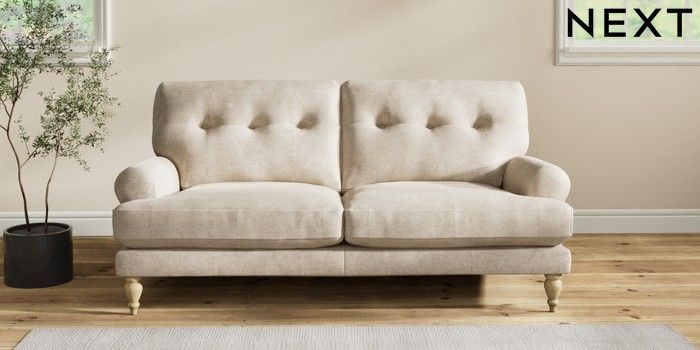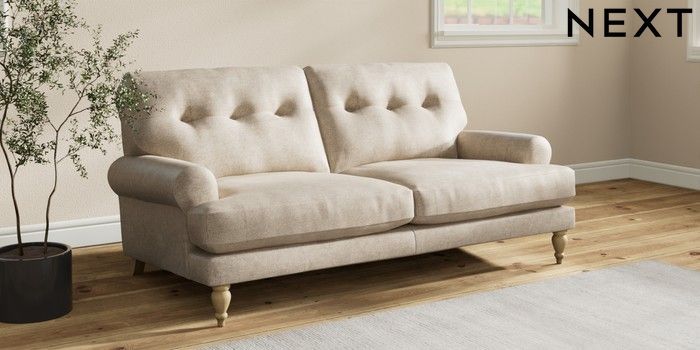 7.2.10 Erin Buttoned Back Deep Relaxed Sit 3 Seater Small Sofa Plush Chenille Light Natural High Classic Turned - Light | Made Click here to use our website with more accessibility support, for example screen readers