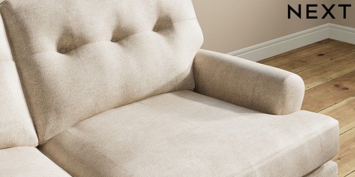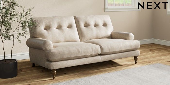 7.2.10 Erin Buttoned Back Deep Relaxed Sit 3 Seater Small Sofa Plush Chenille Light Natural High Classic Turned - Mid | Made Click here to use our website with more accessibility support, for example screen readers