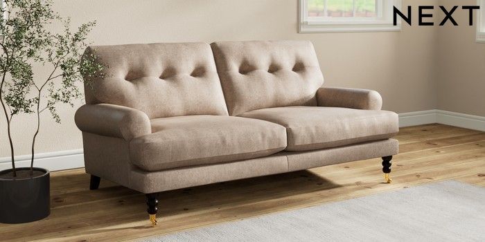 7.2.10 Erin Buttoned Back Deep Relaxed Sit 3 Seater Small Sofa Plush Chenille Mid Natural High Classic Turned Brass Castor - Dark | Made Click here to use our website with more accessibility support, for example screen readers