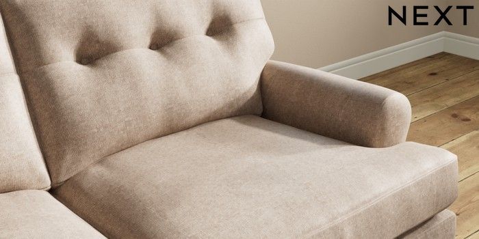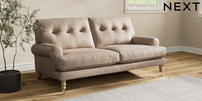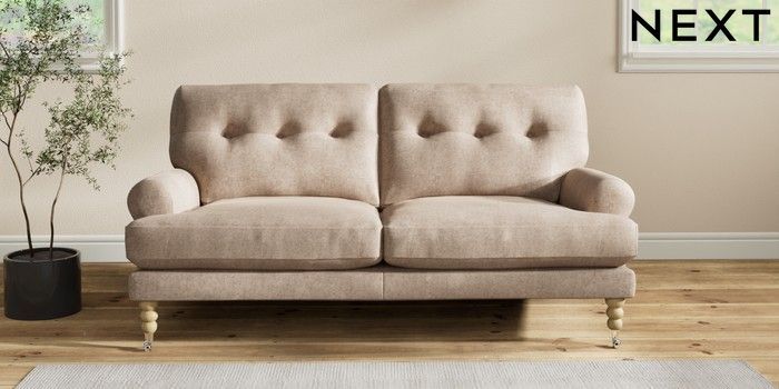 7.2.10 Erin Buttoned Back Deep Relaxed Sit 3 Seater Small Sofa Plush Chenille Mid Natural High Classic Turned Chrome Castor - Light | Made Click here to use our website with more accessibility support, for example screen readers