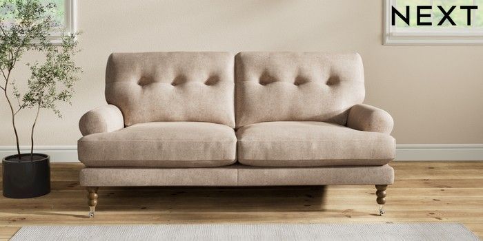 7.2.10 Erin Buttoned Back Deep Relaxed Sit 3 Seater Small Sofa Plush Chenille Mid Natural High Classic Turned Chrome Castor - Mid | Made Click here to use our website with more accessibility support, for example screen readers