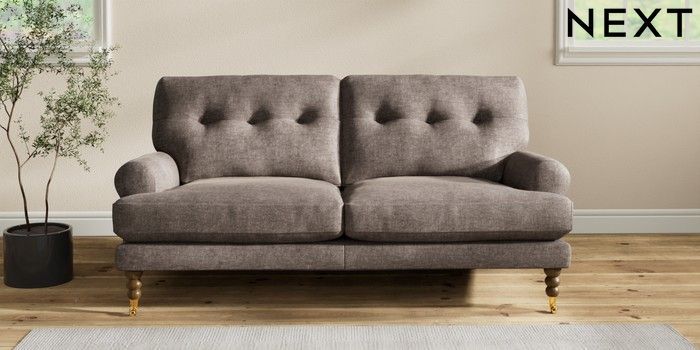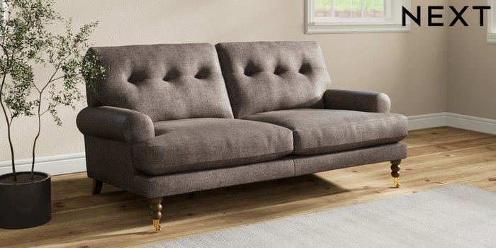 7.2.10 Erin Buttoned Back Deep Relaxed Sit 3 Seater Small Sofa Plush Chenille Mink Brown High Classic Turned Brass Castor - Mid | Made Click here to use our website with more accessibility support, for example screen readers