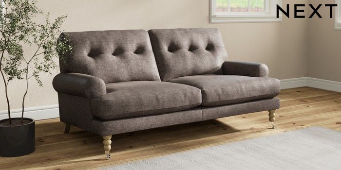 7.2.10 Erin Buttoned Back Deep Relaxed Sit 3 Seater Small Sofa Plush Chenille Mink Brown High Classic Turned Chrome Castor - Light | Made Click here to use our website with more accessibility support, for example screen readers