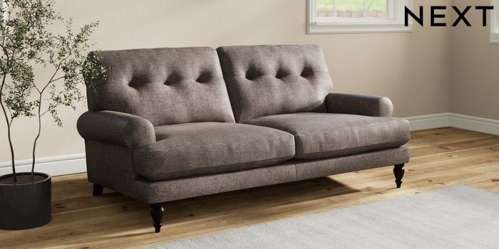 7.2.10 Erin Buttoned Back Deep Relaxed Sit 3 Seater Small Sofa Plush Chenille Mink Brown High Classic Turned - Dark | Made Click here to use our website with more accessibility support, for example screen readers