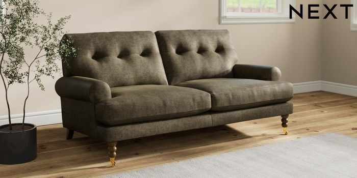 7.2.10 Erin Buttoned Back Deep Relaxed Sit 3 Seater Small Sofa Plush Chenille Moss Green High Classic Turned Brass Castor - Mid | Made Click here to use our website with more accessibility support, for example screen readers