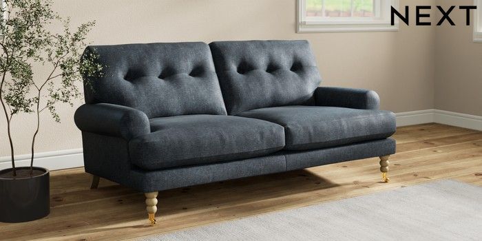7.2.10 Erin Buttoned Back Deep Relaxed Sit 3 Seater Small Sofa Plush Chenille Slate Blue High Classic Turned Brass Castor - Light | Made Click here to use our website with more accessibility support, for example screen readers