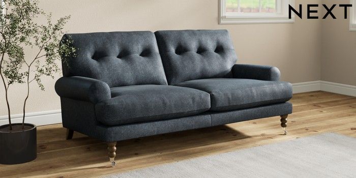 7.2.10 Erin Buttoned Back Deep Relaxed Sit 3 Seater Small Sofa Plush Chenille Slate Blue High Classic Turned Chrome Castor - Mid | Made Click here to use our website with more accessibility support, for example screen readers