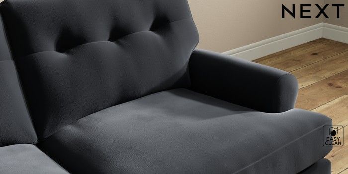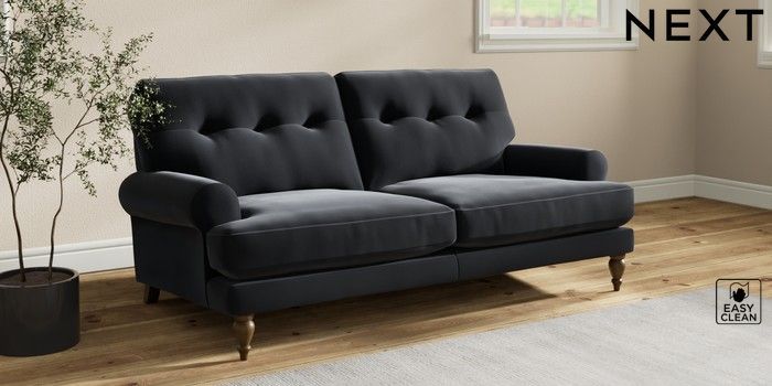7.2.10 Erin Buttoned Back Deep Relaxed Sit 3 Seater Small Sofa Plush Velvet Easy Clean Charcoal Grey High Classic Turned - Mid | Made Click here to use our website with more accessibility support, for example screen readers