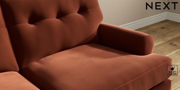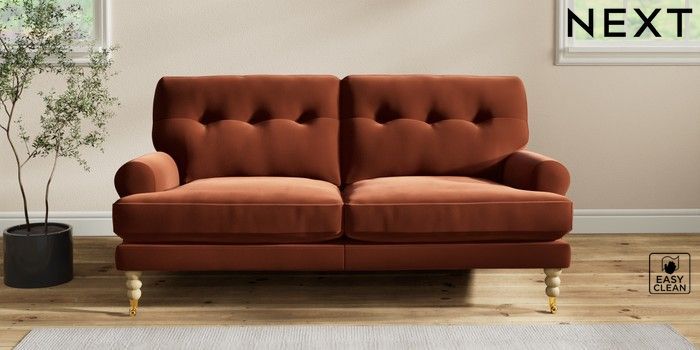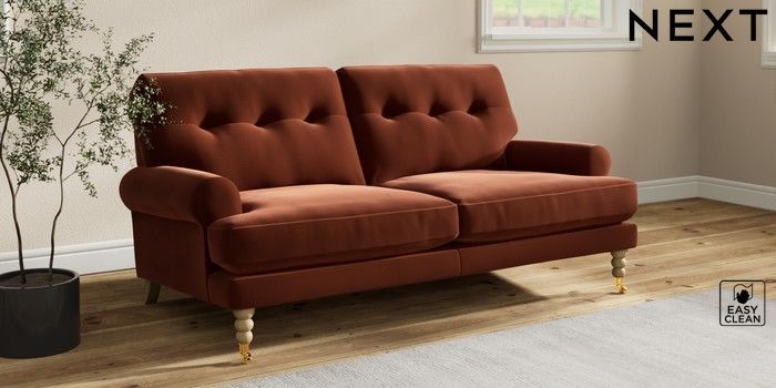 7.2.10 Erin Buttoned Back Deep Relaxed Sit 3 Seater Small Sofa Plush Velvet Easy Clean Ginger Orange High Classic Turned Brass Castor - Light | Made Click here to use our website with more accessibility support, for example screen readers