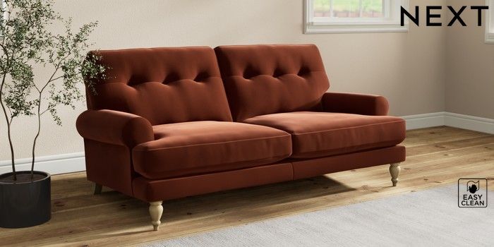 7.2.10 Erin Buttoned Back Deep Relaxed Sit 3 Seater Small Sofa Plush Velvet Easy Clean Ginger Orange High Classic Turned - Light | Made Click here to use our website with more accessibility support, for example screen readers