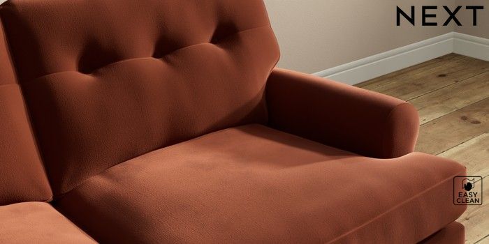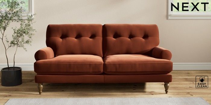 7.2.10 Erin Buttoned Back Deep Relaxed Sit 3 Seater Small Sofa Plush Velvet Easy Clean Ginger Orange High Classic Turned - Mid | Made Click here to use our website with more accessibility support, for example screen readers
