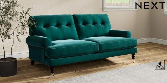 7.2.10 Erin Buttoned Back Deep Relaxed Sit 3 Seater Small Sofa Plush Velvet Easy Clean Juniper Green High Classic Turned Chrome Castor - Dark | Made Click here to use our website with more accessibility support, for example screen readers