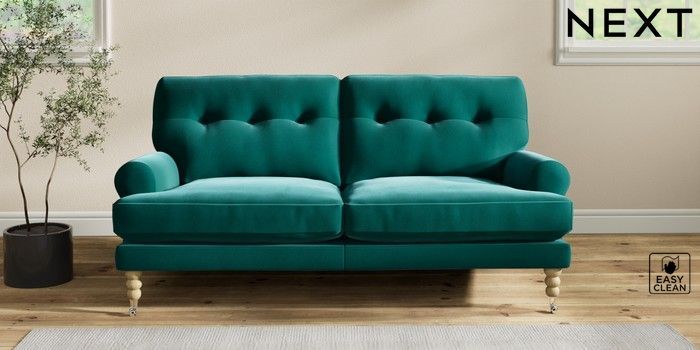 7.2.10 Erin Buttoned Back Deep Relaxed Sit 3 Seater Small Sofa Plush Velvet Easy Clean Juniper Green High Classic Turned Chrome Castor - Light | Made Click here to use our website with more accessibility support, for example screen readers