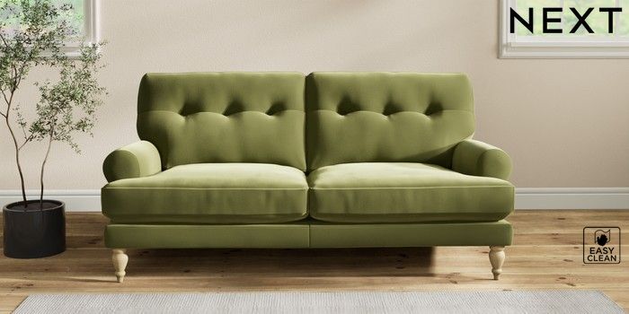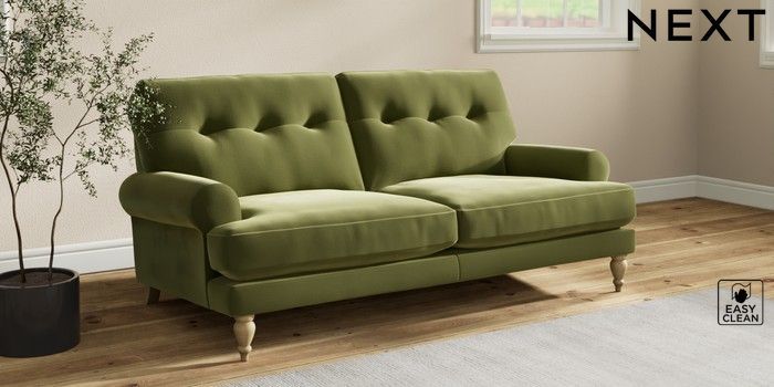 7.2.10 Erin Buttoned Back Deep Relaxed Sit 3 Seater Small Sofa Plush Velvet Easy Clean Mid Olive Green High Classic Turned - Light | Made Click here to use our website with more accessibility support, for example screen readers