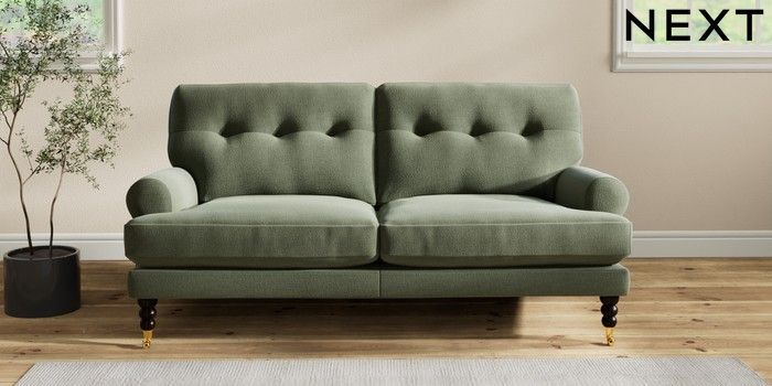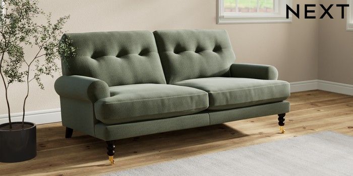 7.2.10 Erin Buttoned Back Deep Relaxed Sit 3 Seater Small Sofa Relaxed Linen Look Dark Green High Classic Turned Brass Castor - Dark | Made Click here to use our website with more accessibility support, for example screen readers