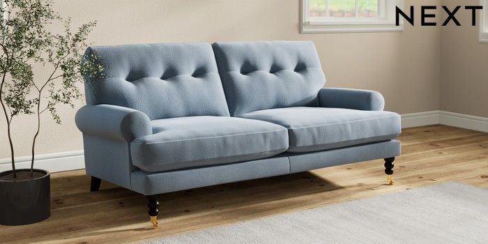 7.2.10 Erin Buttoned Back Deep Relaxed Sit 3 Seater Small Sofa Relaxed Linen Look Mid Blue High Classic Turned Brass Castor - Dark | Made Click here to use our website with more accessibility support, for example screen readers