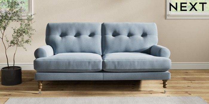 7.2.10 Erin Buttoned Back Deep Relaxed Sit 3 Seater Small Sofa Relaxed Linen Look Mid Blue High Classic Turned Chrome Castor - Mid | Made Click here to use our website with more accessibility support, for example screen readers