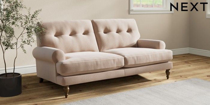 7.2.10 Erin Buttoned Back Deep Relaxed Sit 3 Seater Small Sofa Relaxed Linen Look Mid Natural High Classic Turned - Mid | Made Click here to use our website with more accessibility support, for example screen readers