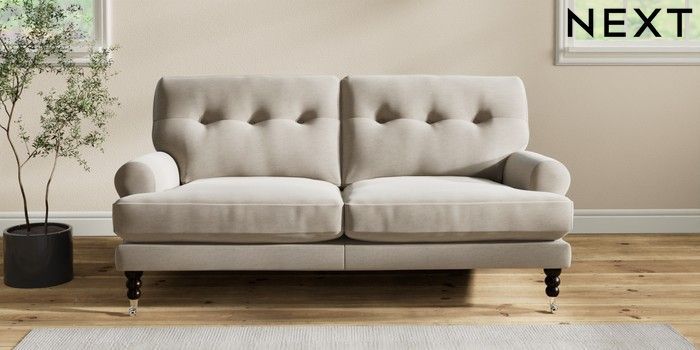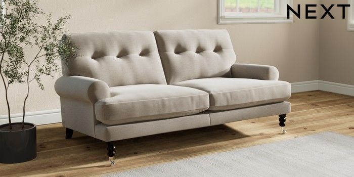 7.2.10 Erin Buttoned Back Deep Relaxed Sit 3 Seater Small Sofa Ripple Chenille Light Natural High Classic Turned Chrome Castor - Dark | Made Click here to use our website with more accessibility support, for example screen readers