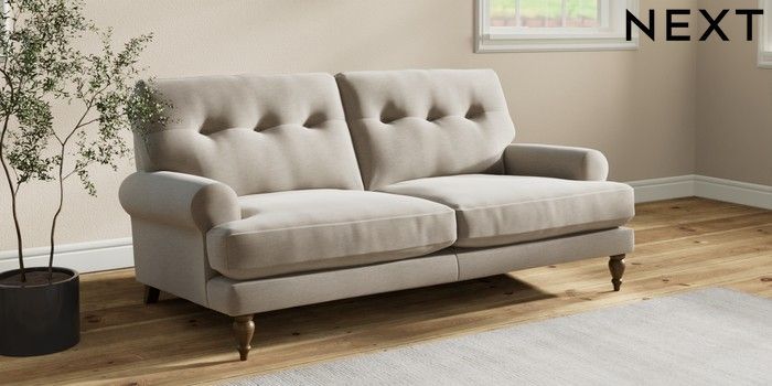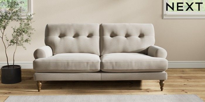 7.2.10 Erin Buttoned Back Deep Relaxed Sit 3 Seater Small Sofa Ripple Chenille Light Natural High Classic Turned - Mid | Made Click here to use our website with more accessibility support, for example screen readers