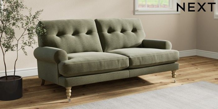 7.2.10 Erin Buttoned Back Deep Relaxed Sit 3 Seater Small Sofa Ripple Chenille Mid Moss Green High Classic Turned Chrome Castor - Light | Made Click here to use our website with more accessibility support, for example screen readers