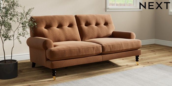 7.2.10 Erin Buttoned Back Deep Relaxed Sit 3 Seater Small Sofa Ripple Chenille Mid Rust Brown High Classic Turned Brass Castor - Dark | Made Click here to use our website with more accessibility support, for example screen readers