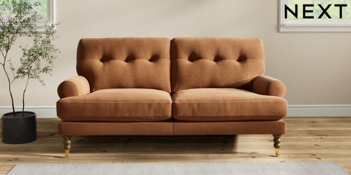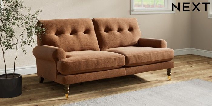 7.2.10 Erin Buttoned Back Deep Relaxed Sit 3 Seater Small Sofa Ripple Chenille Mid Rust Brown High Classic Turned Brass Castor - Mid | Made Click here to use our website with more accessibility support, for example screen readers