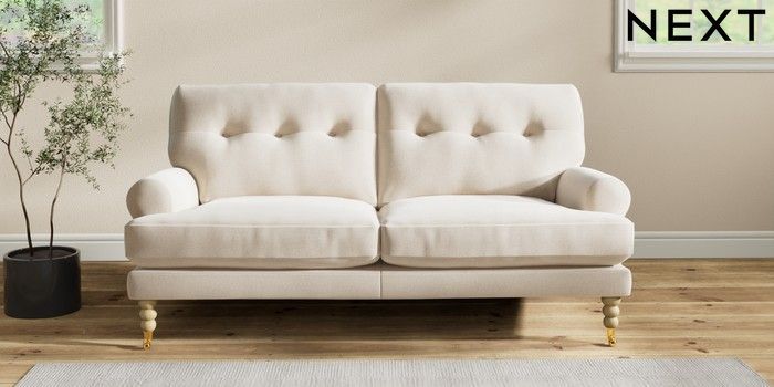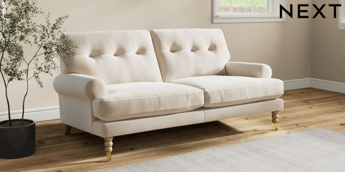 7.2.10 Erin Buttoned Back Deep Relaxed Sit 3 Seater Small Sofa Studio Chenille Oyster High Classic Turned Brass Castor - Light | Made Click here to use our website with more accessibility support, for example screen readers