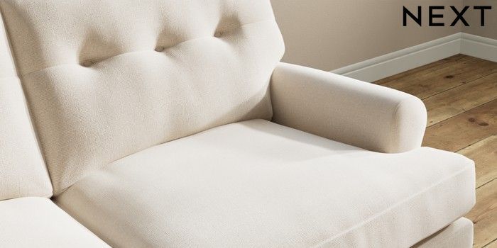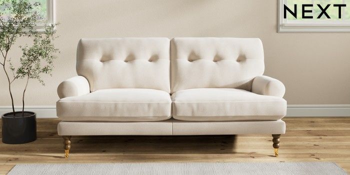 7.2.10 Erin Buttoned Back Deep Relaxed Sit 3 Seater Small Sofa Studio Chenille Oyster High Classic Turned Brass Castor - Mid | Made Click here to use our website with more accessibility support, for example screen readers
