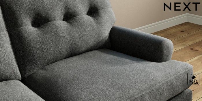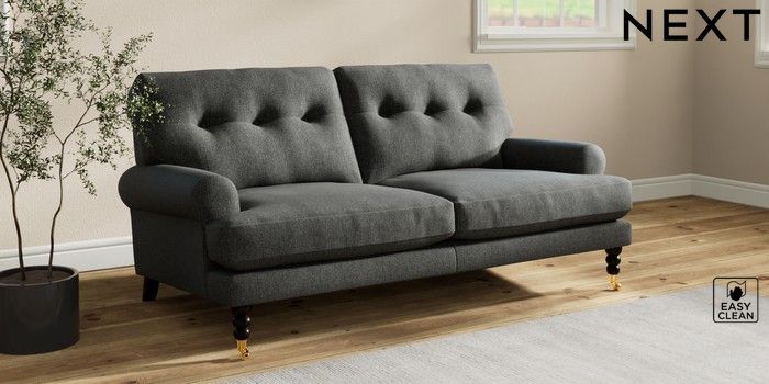 7.2.10 Erin Buttoned Back Deep Relaxed Sit 3 Seater Small Sofa Tweedy Blend Easy Clean Charcoal Grey High Classic Turned Brass Castor - Dark | Made Click here to use our website with more accessibility support, for example screen readers