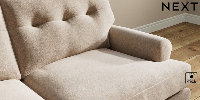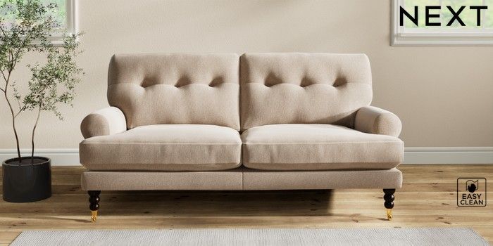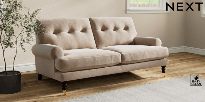 7.2.10 Erin Buttoned Back Deep Relaxed Sit 3 Seater Small Sofa Tweedy Blend Easy Clean Light Dove Natural High Classic Turned Brass Castor - Dark | Made Click here to use our website with more accessibility support, for example screen readers