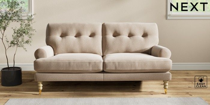 7.2.10 Erin Buttoned Back Deep Relaxed Sit 3 Seater Small Sofa Tweedy Blend Easy Clean Light Dove Natural High Classic Turned Brass Castor - Light | Made Click here to use our website with more accessibility support, for example screen readers