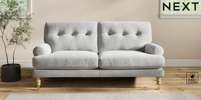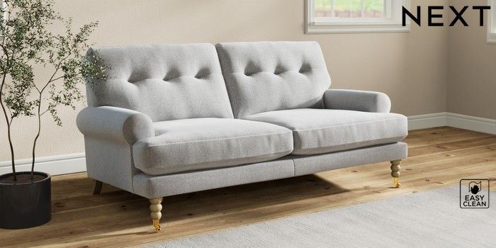 7.2.10 Erin Buttoned Back Deep Relaxed Sit 3 Seater Small Sofa Tweedy Blend Easy Clean Light Silver Grey High Classic Turned Brass Castor - Light | Made Click here to use our website with more accessibility support, for example screen readers