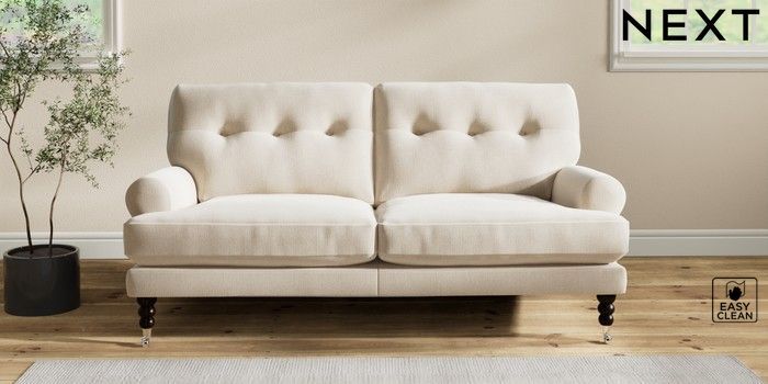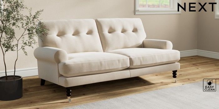 7.2.10 Erin Buttoned Back Deep Relaxed Sit 3 Seater Small Sofa Tweedy Blend Easy Clean Oyster High Classic Turned Chrome Castor - Dark | Made Click here to use our website with more accessibility support, for example screen readers