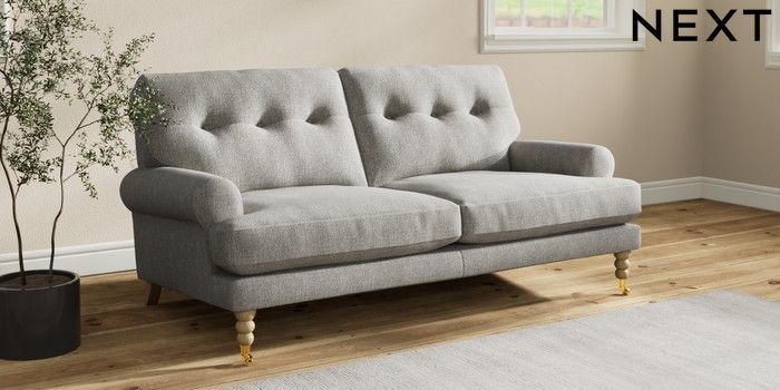 7.2.10 Erin Buttoned Back Deep Relaxed Sit 3 Seater Small Sofa Tweedy Chenille Mid Grey High Classic Turned Brass Castor - Light | Made Click here to use our website with more accessibility support, for example screen readers