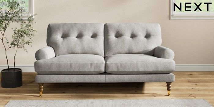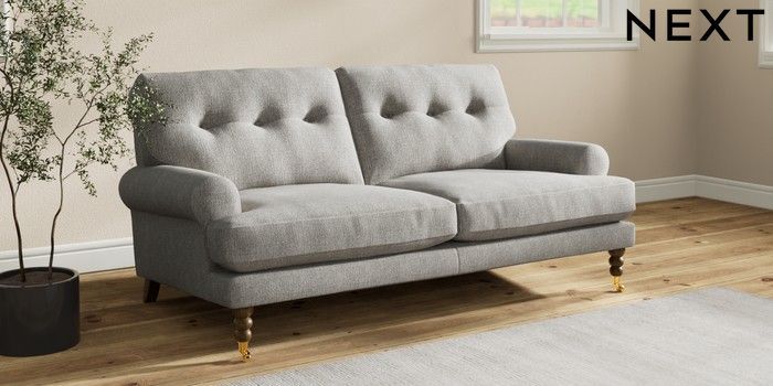 7.2.10 Erin Buttoned Back Deep Relaxed Sit 3 Seater Small Sofa Tweedy Chenille Mid Grey High Classic Turned Brass Castor - Mid | Made Click here to use our website with more accessibility support, for example screen readers