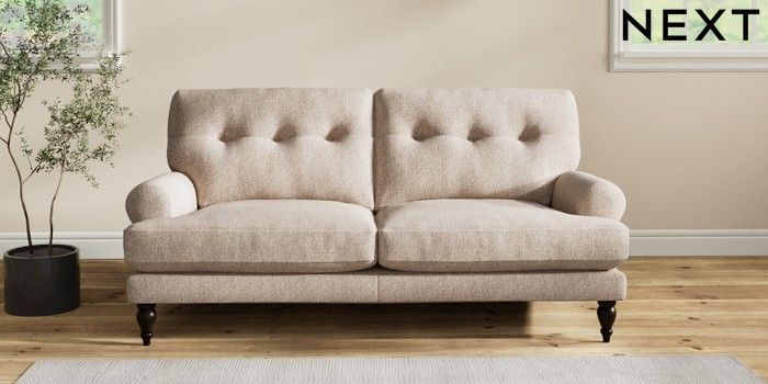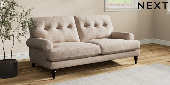7.2.10 Erin Buttoned Back Deep Relaxed Sit 3 Seater Small Sofa Tweedy Chenille Mid Natural High Classic Turned - Dark | Made Click here to use our website with more accessibility support, for example screen readers