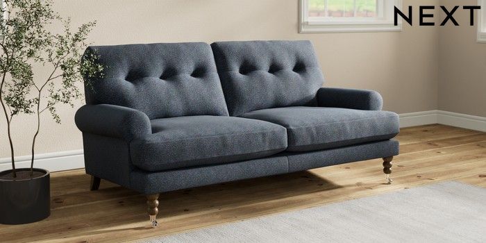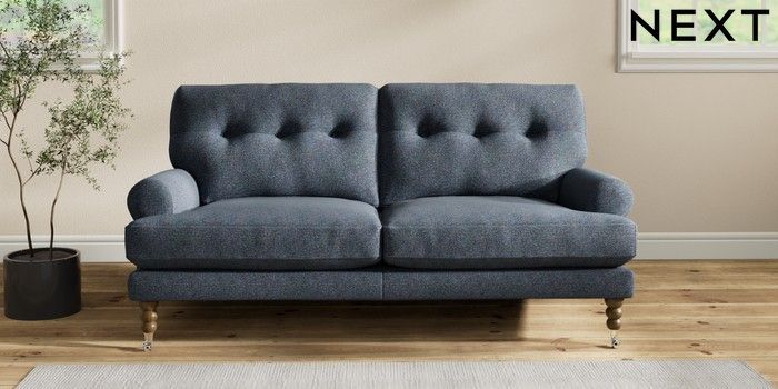 7.2.10 Erin Buttoned Back Deep Relaxed Sit 3 Seater Small Sofa Tweedy Chenille Navy Blue High Classic Turned Chrome Castor - Mid | Made Click here to use our website with more accessibility support, for example screen readers