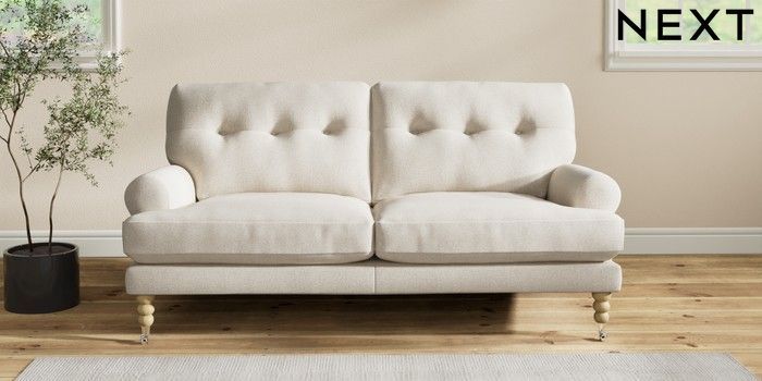 7.2.10 Erin Buttoned Back Deep Relaxed Sit 3 Seater Small Sofa Tweedy Chenille Oyster High Classic Turned Chrome Castor - Light | Made Click here to use our website with more accessibility support, for example screen readers