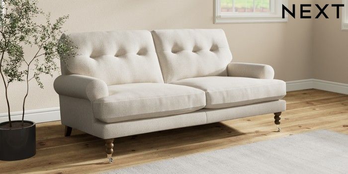 7.2.10 Erin Buttoned Back Deep Relaxed Sit 3 Seater Small Sofa Tweedy Chenille Oyster High Classic Turned Chrome Castor - Mid | Made Click here to use our website with more accessibility support, for example screen readers