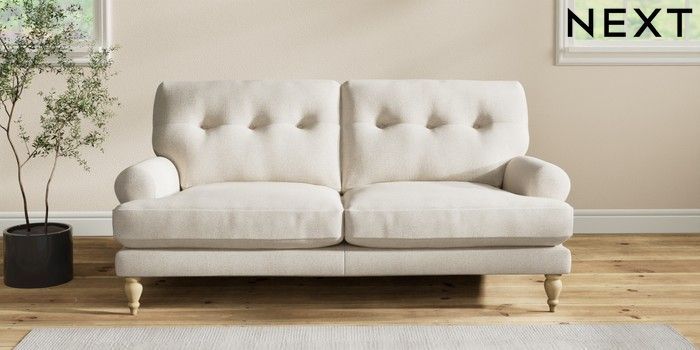 7.2.10 Erin Buttoned Back Deep Relaxed Sit 3 Seater Small Sofa Tweedy Chenille Oyster High Classic Turned - Light | Made Click here to use our website with more accessibility support, for example screen readers