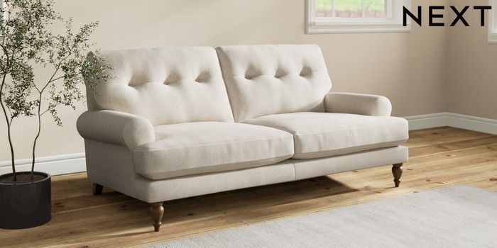 7.2.10 Erin Buttoned Back Deep Relaxed Sit 3 Seater Small Sofa Tweedy Chenille Oyster High Classic Turned - Mid | Made Click here to use our website with more accessibility support, for example screen readers