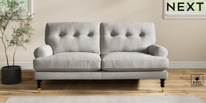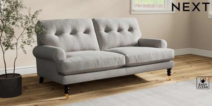 7.2.10 Erin Buttoned Back Deep Relaxed Sit 3 Seater Small Sofa Woven Chenille Easy Clean Light Grey High Classic Turned Brass Castor - Dark | Made Click here to use our website with more accessibility support, for example screen readers