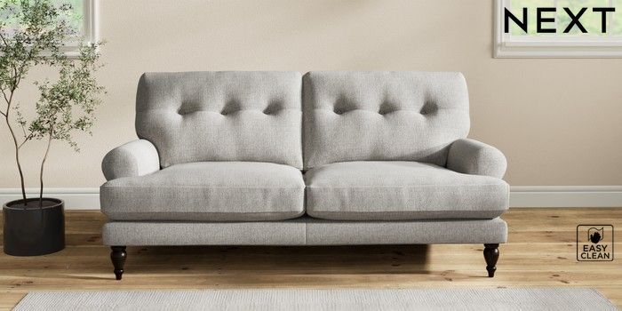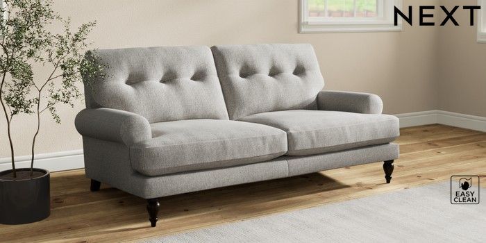 7.2.10 Erin Buttoned Back Deep Relaxed Sit 3 Seater Small Sofa Woven Chenille Easy Clean Light Grey High Classic Turned - Dark | Made Click here to use our website with more accessibility support, for example screen readers