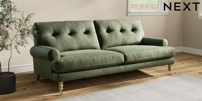 7.2.10 Erin Buttoned Back Deep Relaxed Sit 3 Seater Sofa Boucle Chenille Dark Moss Green High Classic Turned Chrome Castor - Light | Made Click here to use our website with more accessibility support, for example screen readers
