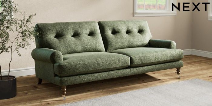 7.2.10 Erin Buttoned Back Deep Relaxed Sit 3 Seater Sofa Boucle Chenille Dark Moss Green High Classic Turned Chrome Castor - Mid | Made Click here to use our website with more accessibility support, for example screen readers